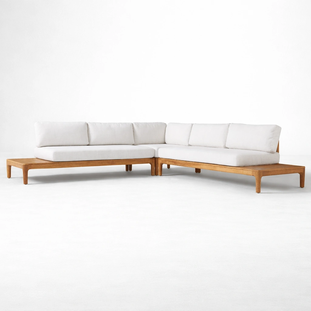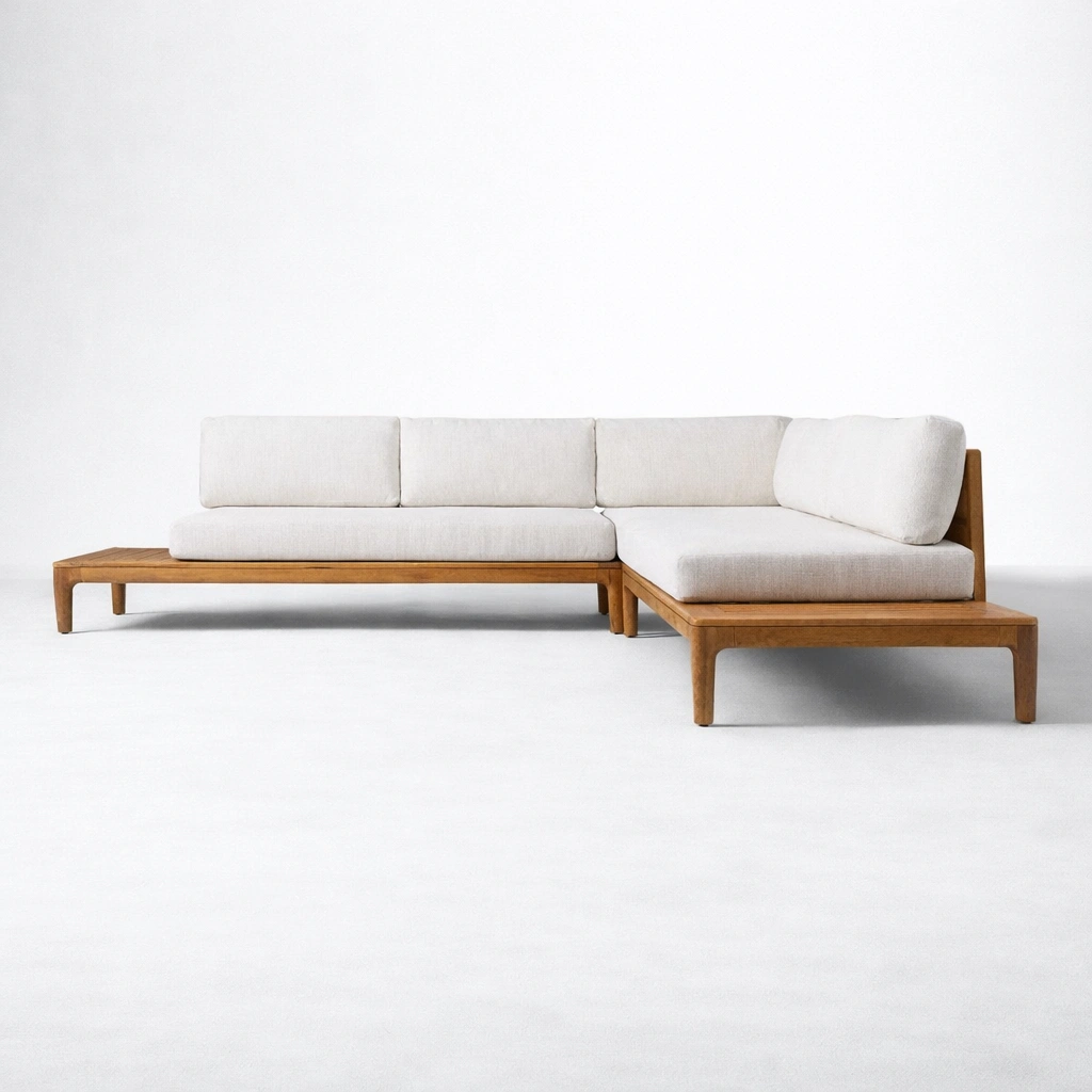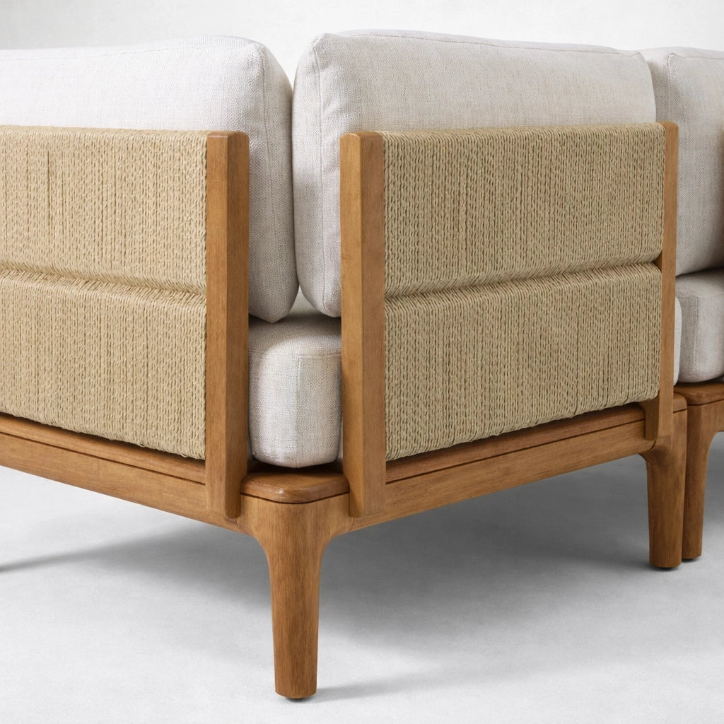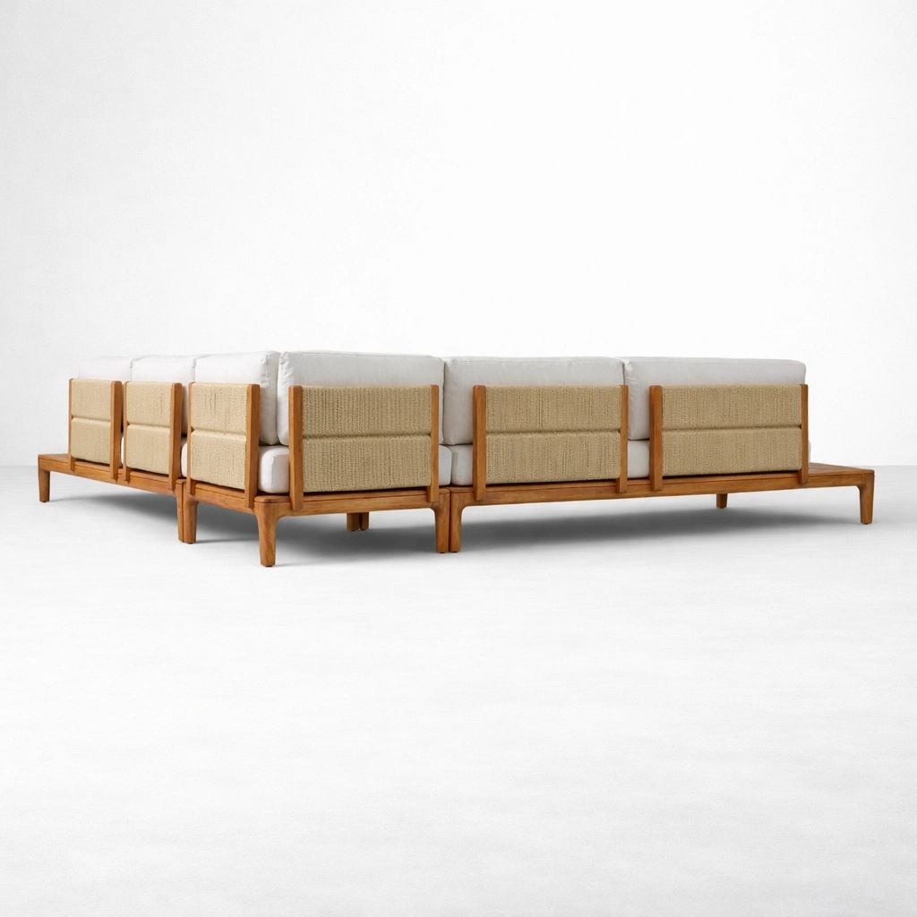 If you are looking for a relaxed, premium sectional that stays timeless, Riviera is made with solid teak wood, woven rope side panels, and comfortable ivory cushions. The shape is clean and modern, while the materials are chosen for everyday practicality in patios, verandas, and well-ventilated indoor spaces teak wood outdoor l shaped sofa.