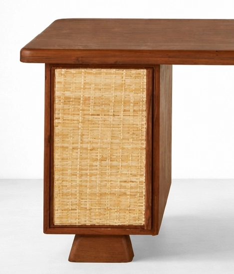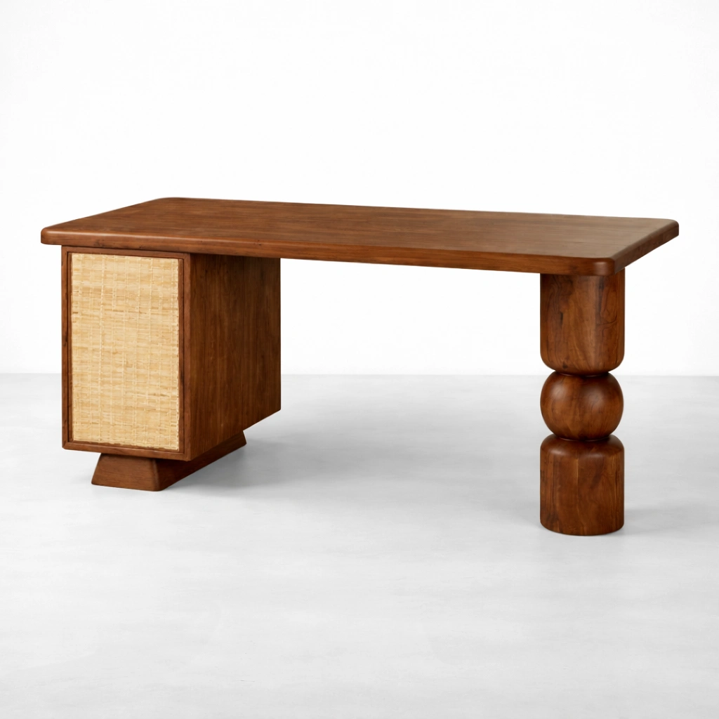 Made in teak wood, this study table offers a generous work surface for laptop use, writing, reading, and everyday office tasks. One side is supported by a cabinet-style pedestal with a woven cane front, while the other side features a sculptural turned wooden leg that gives the design a soft architectural identity. This thoughtful combination makes the table functional without losing its decorative value teak wood study table with cane panel.