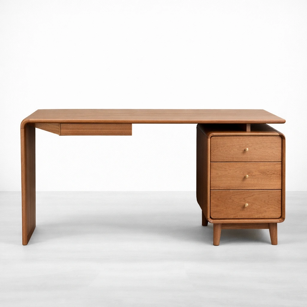 Its design combines a broad tabletop with a soft rounded edge profile that helps the table feel smooth, minimal, and visually balanced. The attached three-drawer storage unit adds utility without making the piece look heavy, while the open space above the drawers creates a light and airy transition under the tabletop. This makes the teak wood study table suitable for both focused work and styled interiors.