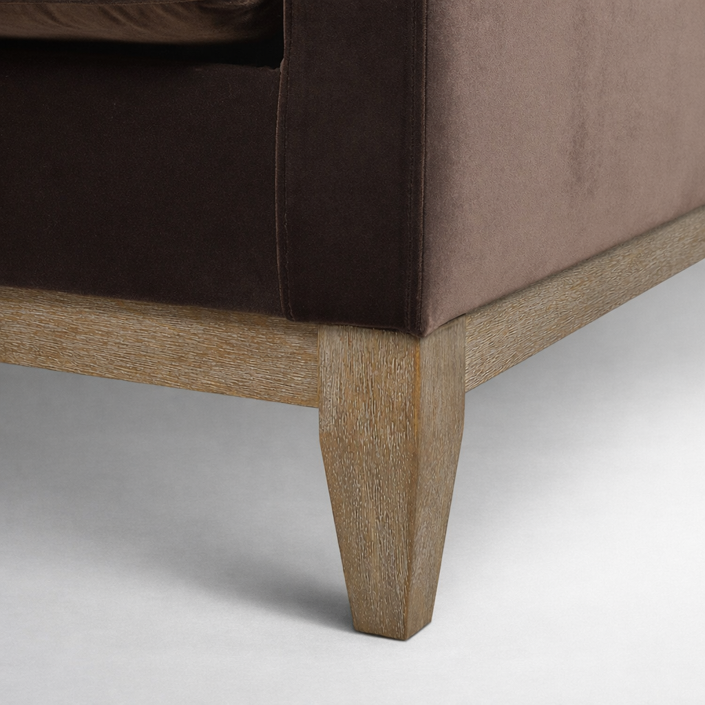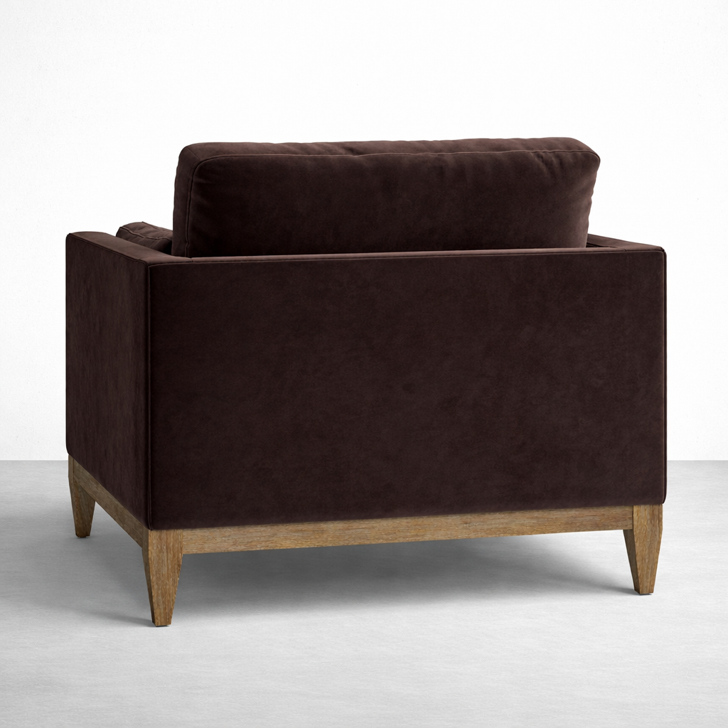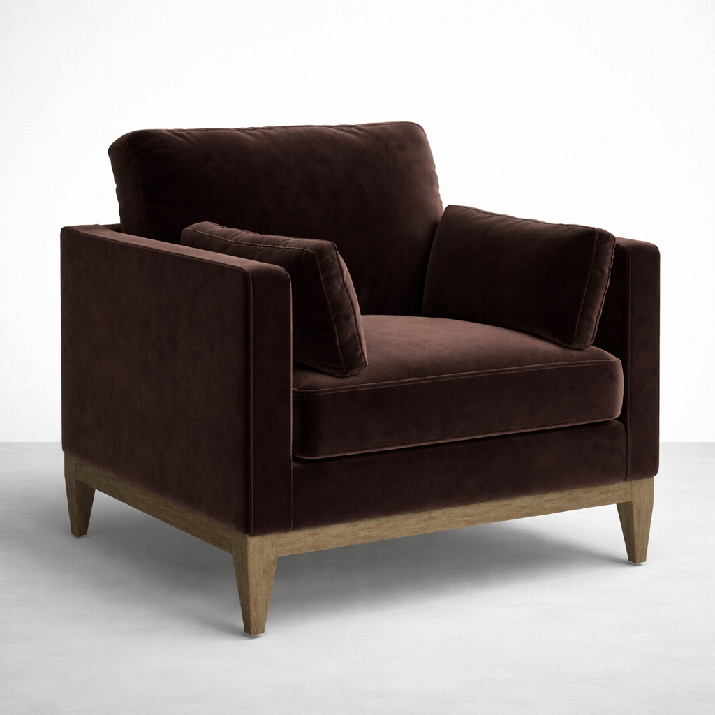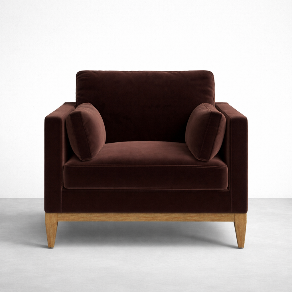 Cairo is a teak wood velvet armchair created for quiet comfort and everyday use. The clean, boxy silhouette keeps the look simple, while the plush seat and supportive backrest help you settle in comfortably. Upholstered in chocolate brown velvet and set on a solid teakwood base, this piece is made to order by INTERIORZE with customization options to suit your home.