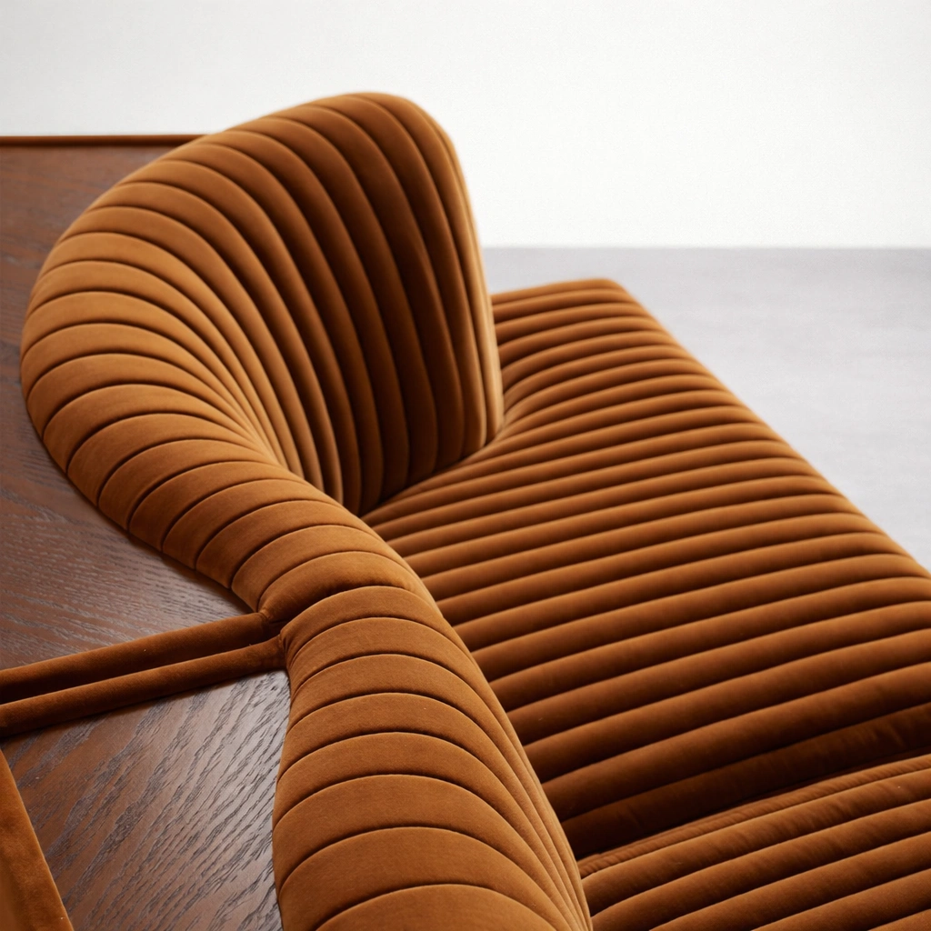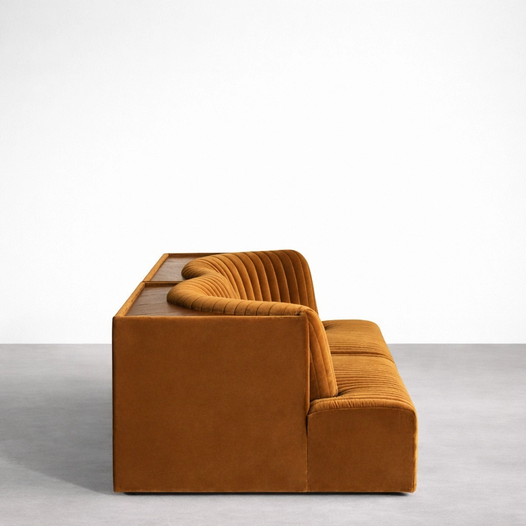 This teakwood velvet sofa is designed for homes that want a warm statement without loud styling. The caramel brown velvet brings a rich, grounded tone, while the vertical channel tufting gives the sofa a structured look across the seat and back. The silhouette stays low and lounge-friendly, so the sofa feels relaxed even in formal spaces teakwood velvet sofa.
