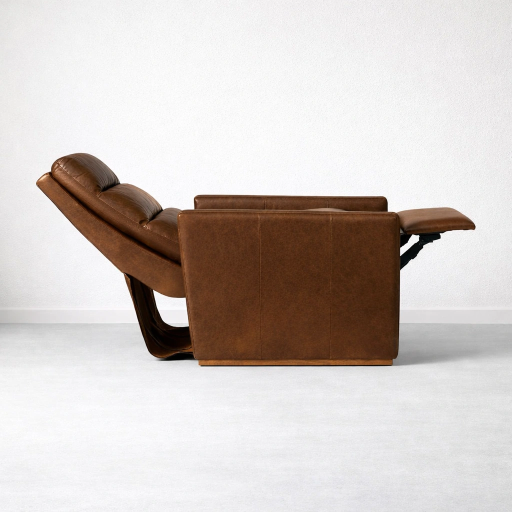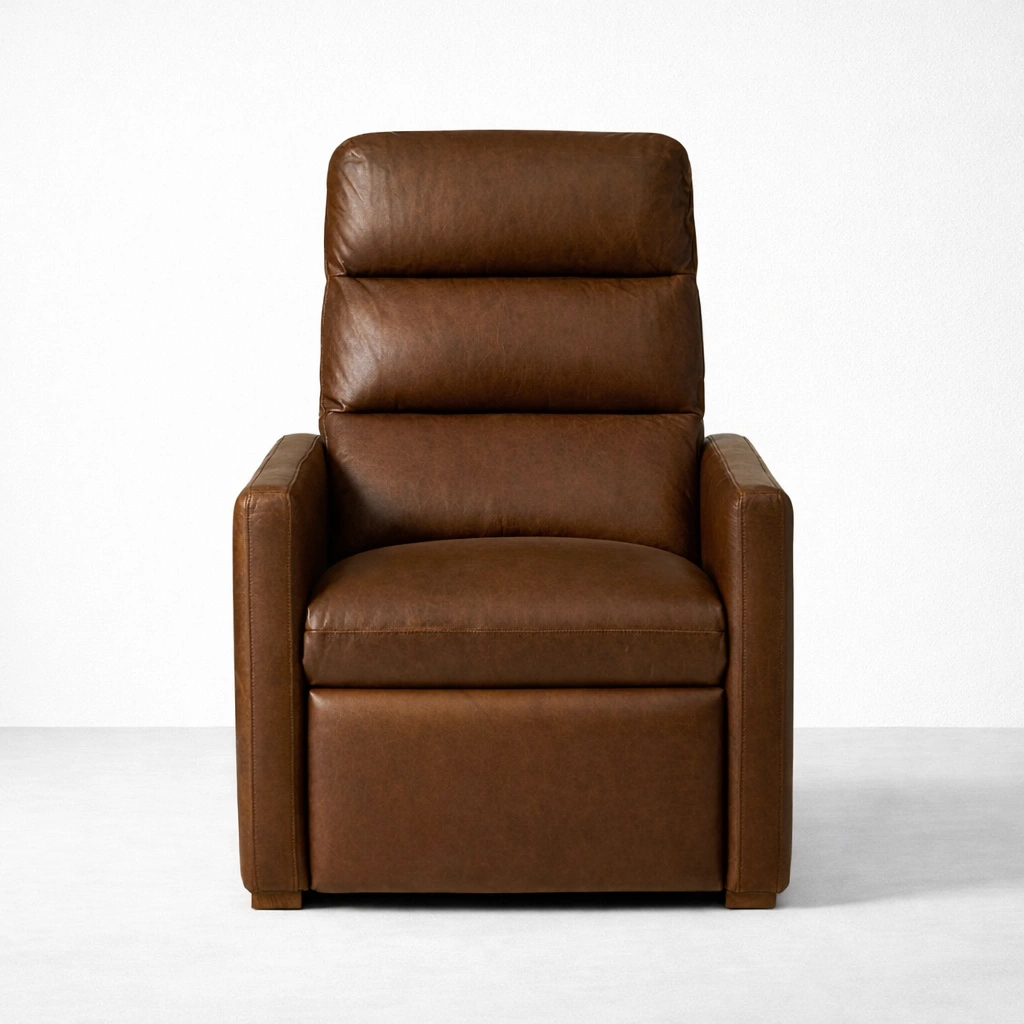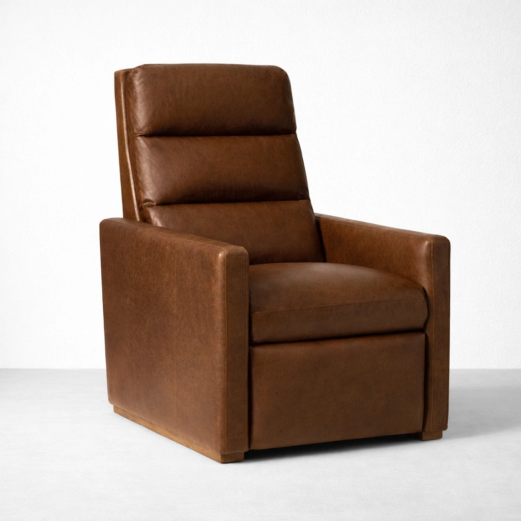 The Verona recliner is built on a solid teakwood internal frame with a reinforced steel reclining mechanism. Upholstery shown is premium brown leather-look (PU/leatherette) that is easy to maintain for daily use. If you prefer a different feel, we can craft it in genuine leather or selected fabrics.