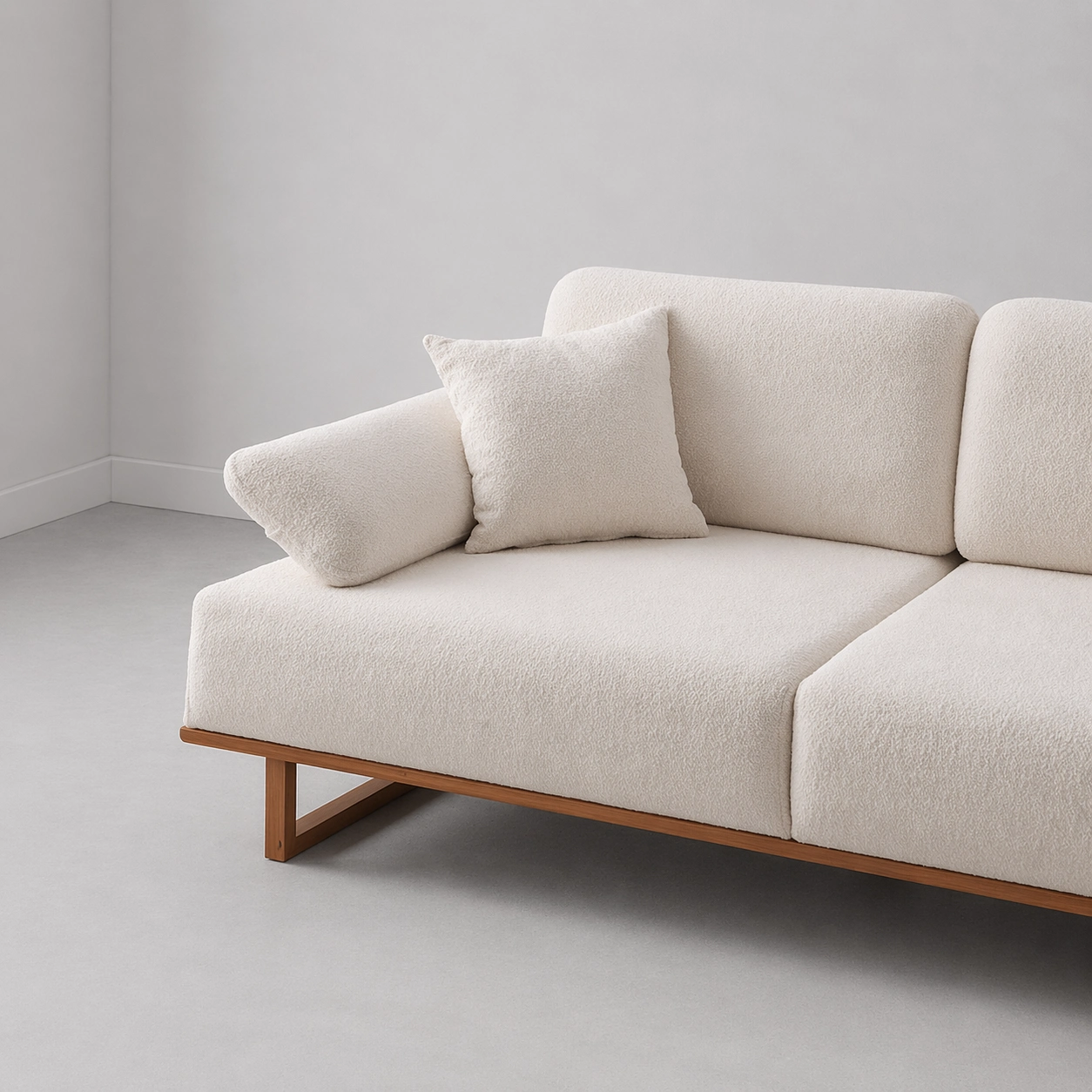 This sofa features a spacious 3-seater layout, soft textured fabric, low-profile wooden frame, supportive backrest, loose pillows, and comfortable arm cushions. The wooden base gives natural warmth, while the white upholstery creates a bright, elegant, and modern look white boucle sofa.