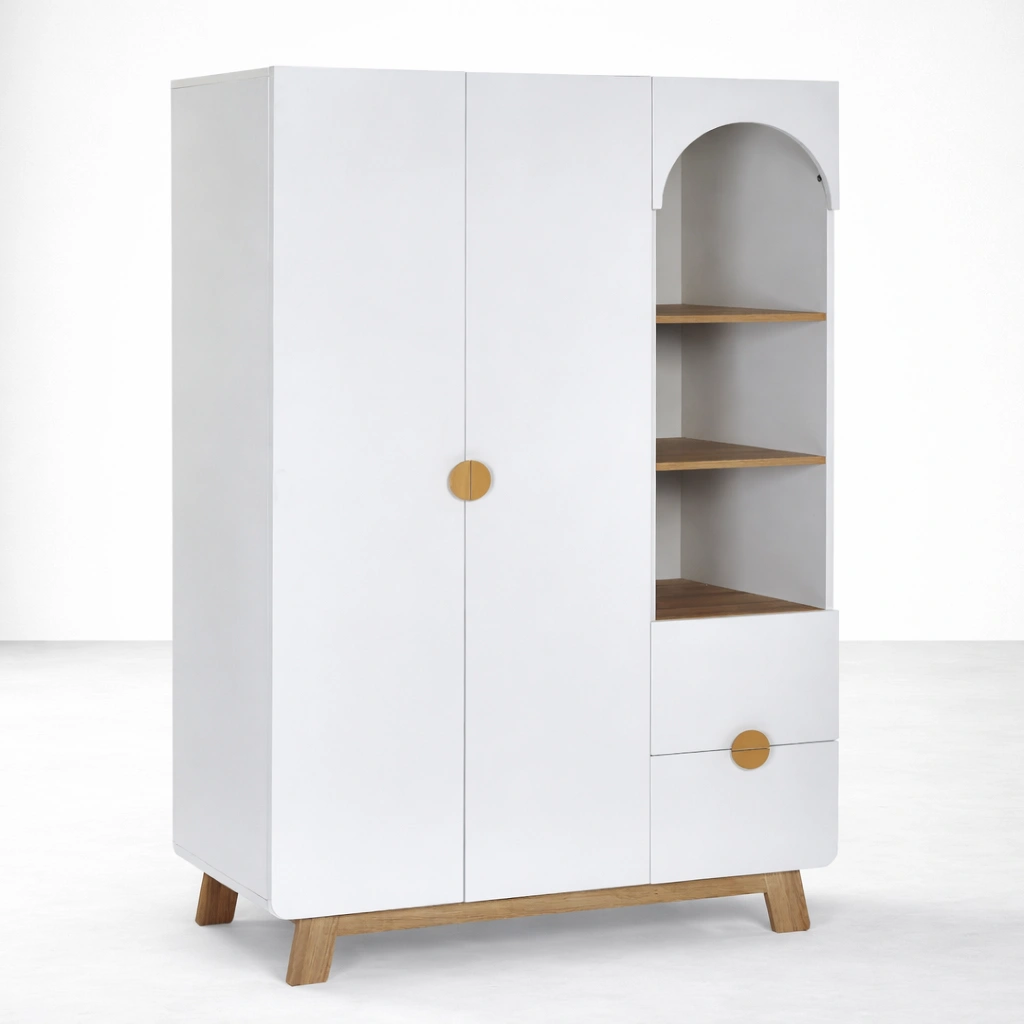 Design Highlight: Clean white wardrobe with arched open shelf, round wooden pulls, and drawer storage