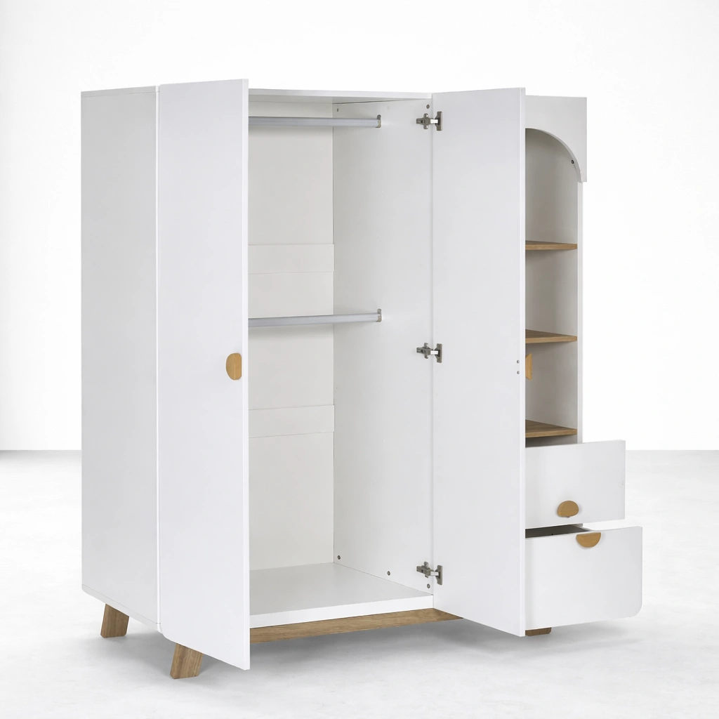 This white wardrobe with open shelves offers a useful combination of enclosed hanging storage, visible display shelving, and drawer storage in one compact design. The main wardrobe section is suitable for hanging garments neatly, while the side arched shelves can be used for folded essentials, décor objects, books, baskets, or daily-use accessories.
