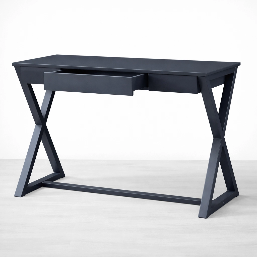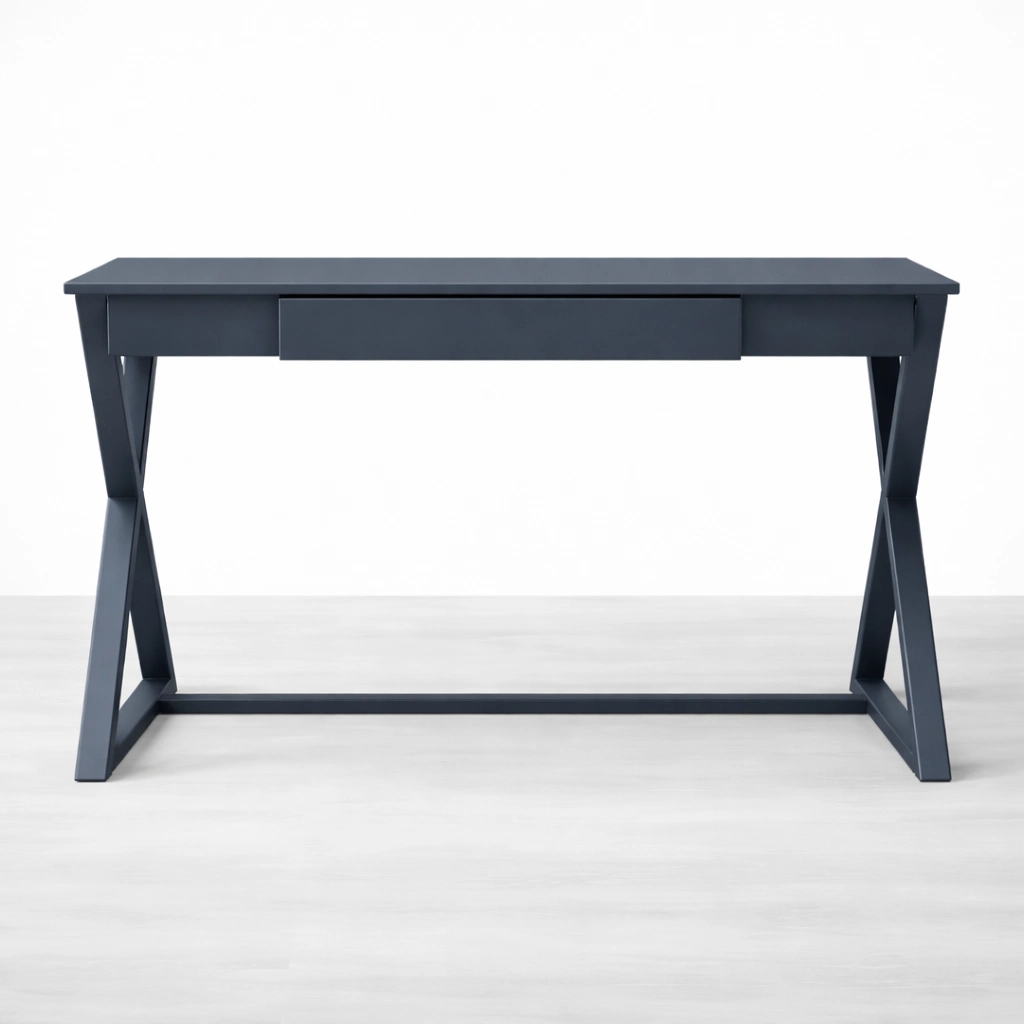The INTERIORZE x leg teak wood study table is thoughtfully designed for customers who prefer a clean work surface, practical storage, and a refined modern silhouette. Crafted in teak wood, this study table features a broad rectangular top, one useful drawer, and a distinctive cross-leg profile that gives the piece a strong and balanced identity.